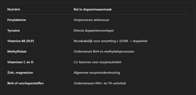 Dopamine is een essentiële neurotransmitter die invloed heeft op motivatie, stemming, concentratie, beloning en motoriek. De aanmaak van dopamine in de hersenen is een complex, meerstapsproces dat afhankelijk is van aminozuren, cofactoren (vitaminen en mineralen) en de werking van bepaalde genen.